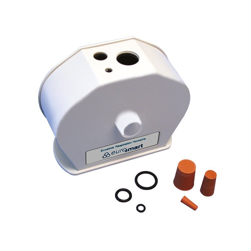 Cette enceinte est destinée aux expériences sur la respiration humaine. Elle permet de mesurer les évolutions en O2 et en CO2 de la respiration d’un sujet. En effet deux trous prévus à cet effet, respectivement Ø18,6mm et Ø12mm, permettent l’insertion d’une sonde dioxygène et d’une sonde à dioxyde de carbone. Un 3ème trou de Ø6mm permet d’ajouter à l‘ensemble une sonde de température. Cette enceinte est livrée avec tous les accessoires nécessaires à son utilisation (voir Fiche technique). Points forts:                                                                                                                                                                                                                                                          Fourni avec tous les accessoires Principales caractéristiques : Livré avec : * 1 tube en Y avec valves anti-retour * 1 tuyau (Ø22 mm) * 2 manchons pour tuyau (Ø22 mm) * 4 filtres anti-bactériens * 4 embouts buccaux * 3 bouchons d’obturation * 6 joints d’étanchéité